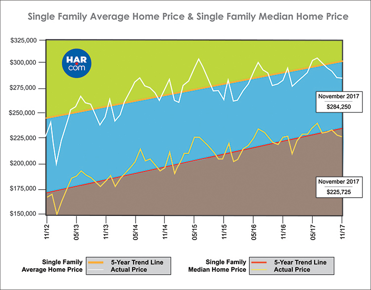 Prices reached the highest levels ever for a November in Houston. The median price eked out a fractional 0.3 percent increase to $225,725. The average price rose 0.9 percent to $284,250.