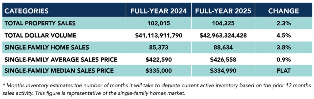 - Total property sales for full-year 2025 were up 2.3% with 104,325 units sold while the total dollar volume increased 4.5% to $42.9 billion.