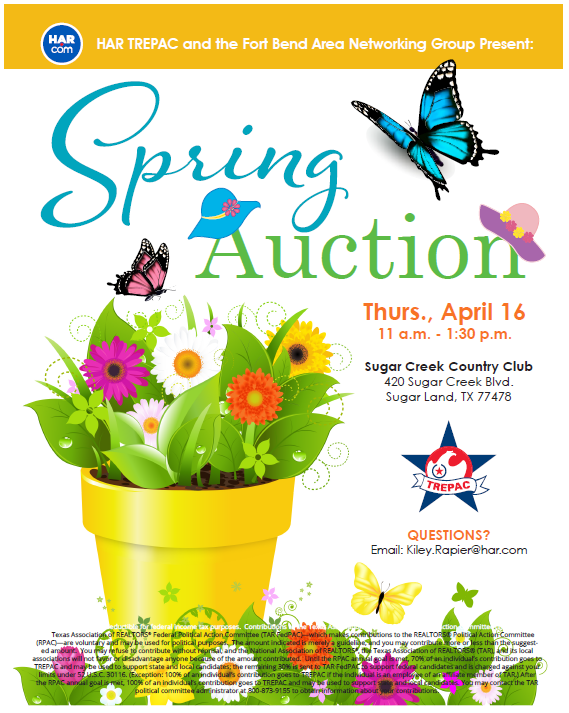 TREPAC and the Fort Bend Area Networking Group Present a Spring Auction. Join us Thursday, April 16 at Sugar Creek Country Club.